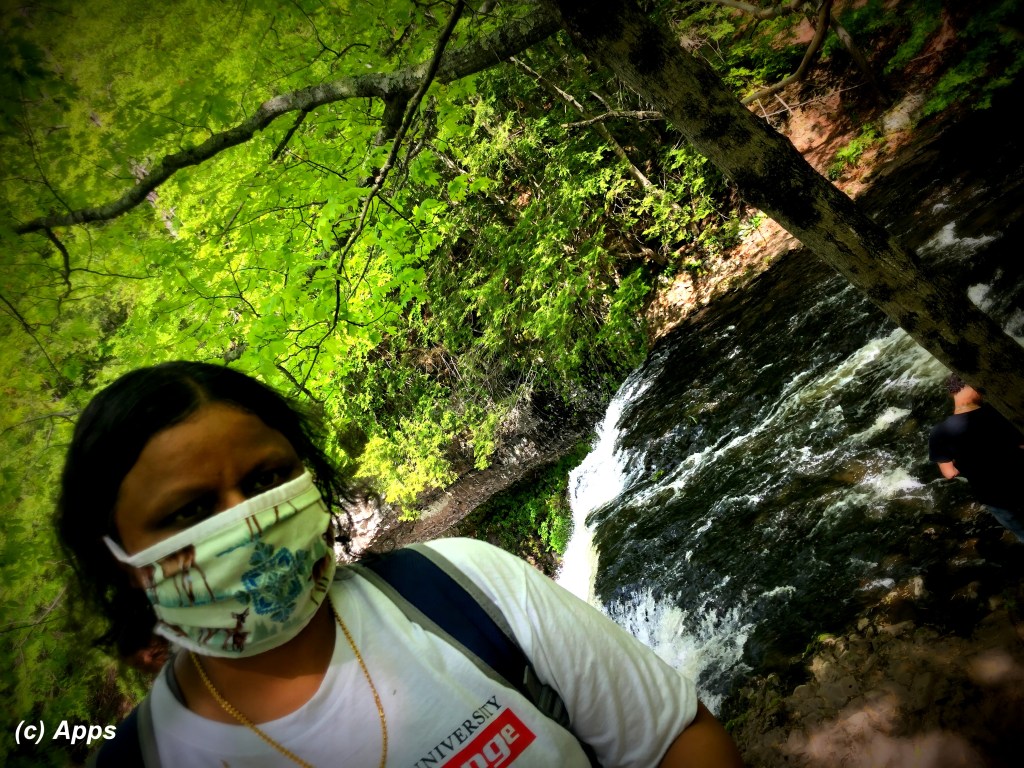 However the day of the hike, the Wadsworth Big Falls made it up double and plenty, giving us a feast for eyes, ears, soul and mind. Here is a view of it from the top lookout point behind me.