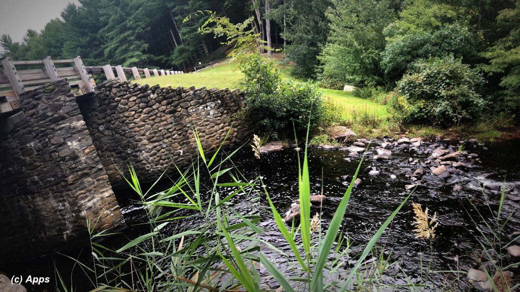 The water flows from underneath the bridge and becomes a simple trail of brook, Chatfield Brook, that smoothly runs from there on over a rocky terrain.