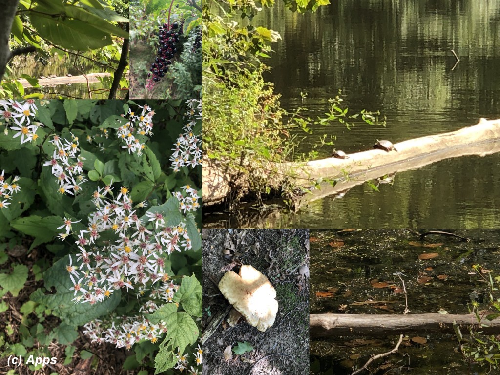 Some of the flora and fauna we saw along the trail are: Lily Pads on one end of the pond; Berries and Flowers; Fungi; and a family of turtles (or tortoises may be!) basking in the sun.