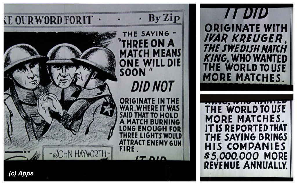 - This movie was part of a promotion campaign that Ivar Kreuger, the Swedish Match King, used to sell more matches by cutting down on sharing. Incidentally Warren William’s next film was the 1932 American pre-Code drama film The Match King loosely based on Kreuger’s life and suicide. Warren played the title role in that film. There is even a montage promoting Kreuger’s cigarettes. Montage also talks about the made-up superstition.