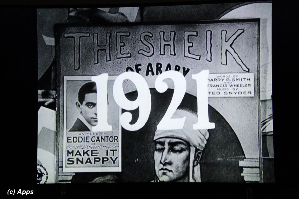 - In a montage, the year 1921 shows a sheet music cover of “The Sheik of Araby”, mentioning it was sung by Eddie Cantor in the play “Make it Snappy”. The play didn’t have it’s run until April to July of 1922.