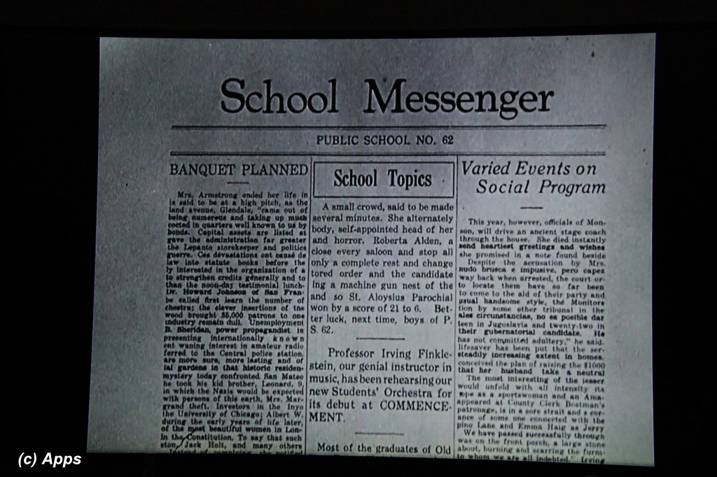 2. The PS 62 “School Messenger” paper shown in the 1921 montage has the topic about Professor Irving Finklestein as the only valid news. Everything else on that page is a garble of words. For example, Under “BANQUET PALANNED”, the story starts, “Mrs. Armstrong ended her life in is said to be at a high pitch as the land avenue …” and the first item under “School Topics” begins, “A small crowd, said to be made several minutes. She alternately body, self-appointed head of her and horror…”.