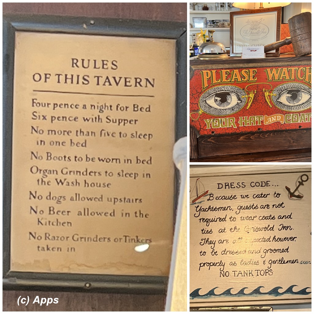 The Griswold Inn is on the historic Main Street of the seaport town of Essex in Connecticut. The walls of the inn are covered with pictures and memorabilia from centuries and decades gone by showing us the progression from the Revolution times in the 1700s to the most modern maritime artifacts. It’s a treasure trove of information.
