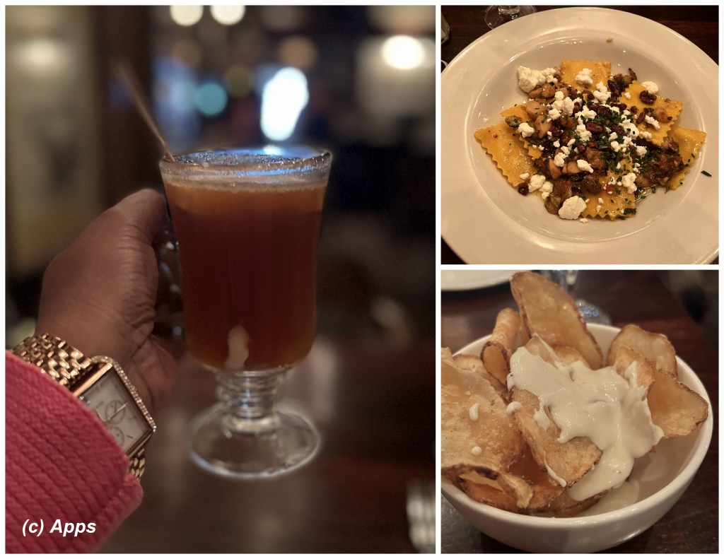 I had Hot Buttered Rum and Butternut Squash Ravioli with a side of their warm House Chips topped with sour cream.