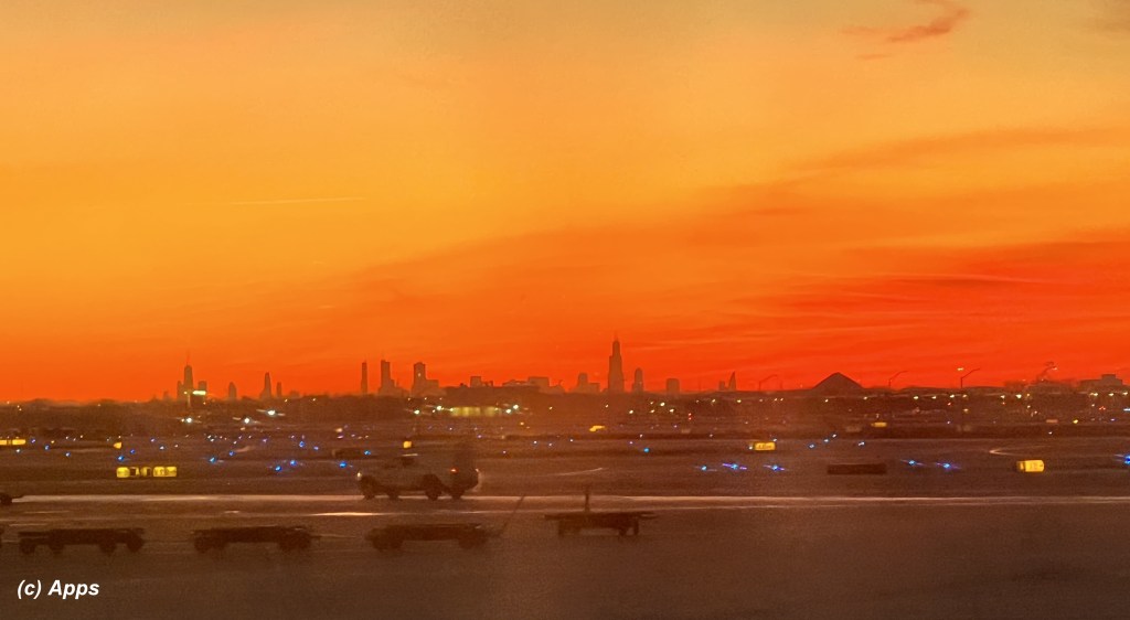 As we were landing, though the sun was not up, the sky was covered in bright orange hues and you could see the Chicago Skyline in the distant.