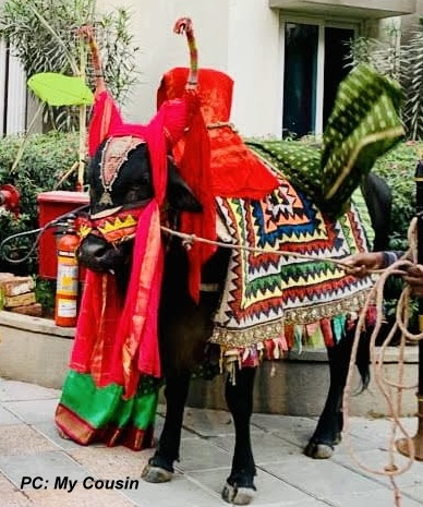 Kanuma is festival of cattle, in other words we worship the cattle to return the favor back to them as they aid the people in farming and in turn help in prosperity. On this day we see cows decked up and strolled through the streets. Food and money are offered in return for blessings from the cow. Here is one that was decorated in my cousin’s apartment complex for the festival this year..