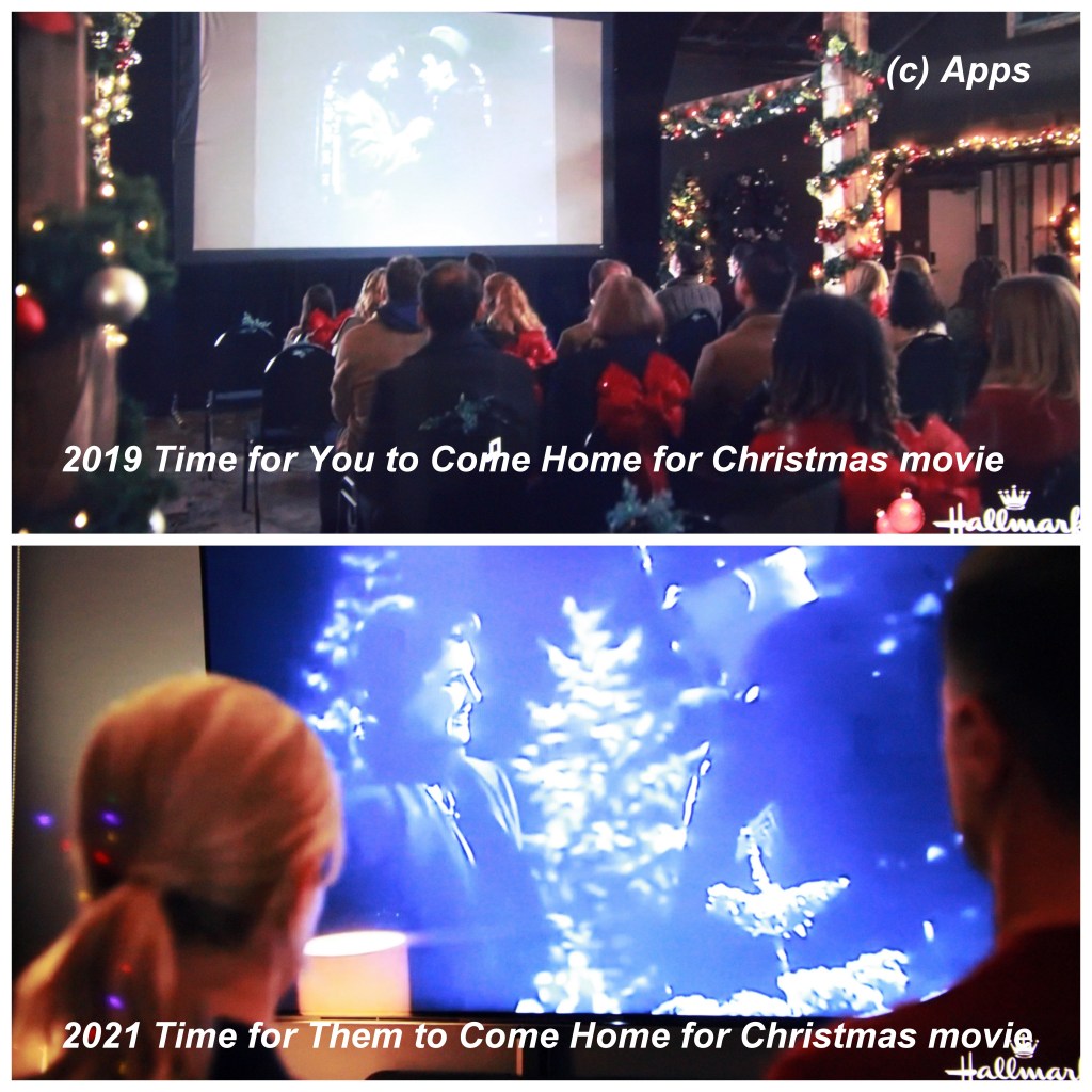 iii. In the 2019 Time for You to Come Home for Christmas movie, lead cast Lucas Bryant and Alison Sweeney’s characters Jack Sutherland and Katherine Moss respectively watch the 1940 American fantasy film Beyond Tomorrow being played in the barn scene. In the 2021 Time for Them to Come Home for Christmas movie, the lead cast Jessy Schram and Brenda Penny’s characters Rebecca and Paul Bennett respectively watch the same movie in the hotel room while they are sheltering from snow.