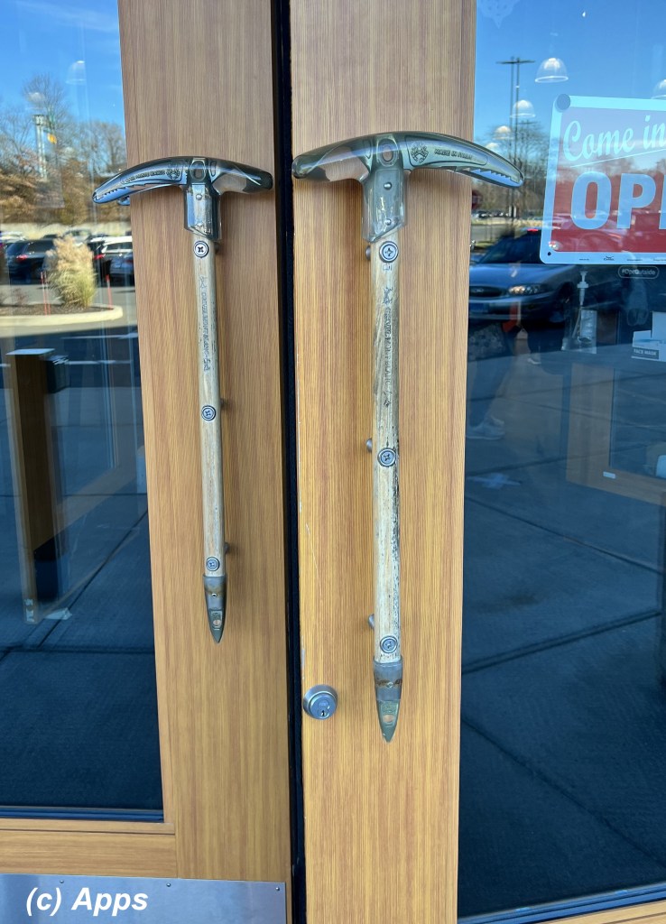 At the REI store in West Hartford, Connecticut, you will need an Ice Axe to open their door. No, really!!! Their door handles are huge Ice Axes. Made again by REI.