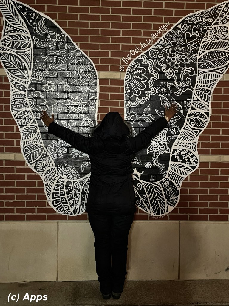 I am not sure if this mural still exists, but we found this in 2021 when a friend and I went on winter wonderland walk through the lanes of Blue Back Square in West Hartford, Connecticut. This was painted on one wall of the Ooh Lala Boutique. Beautiful wings of a bird or a bug, creatively done by an anonymous artist.