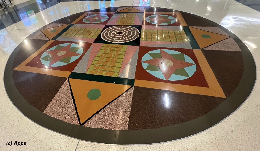 This 20-foot diameter circular floor medallion can be seen at the Departure Level Concourse in Terminal D at Dallas Fort Worth International Airport (DWF) in Dallas, Texas. This medallion uses the traditional Parcheesi board game to move the passenger to the center with the three-letter internal airport codes as spaces along the way. Designed by Pamela Nelson in 2005, acclaimed artist from Dallas.