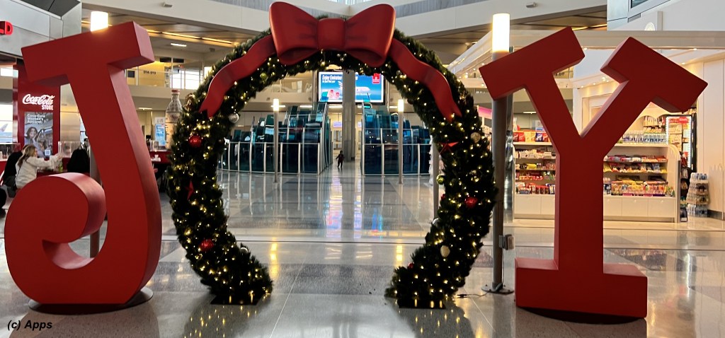 One final attraction I want to mention from Dallas Fort Worth International Airport in Dallas, Texas is the huge Christmas decoration that simply says “Joy” with the O as a biglighted wreath in the center. Apparently this decoration moves from Terminal to Terminal every year. This past holidays while returning back to CT I found this at Terminal D. Wonder where it will go next! π