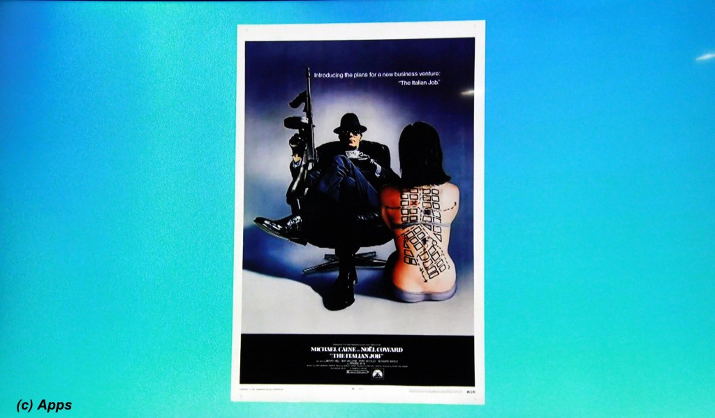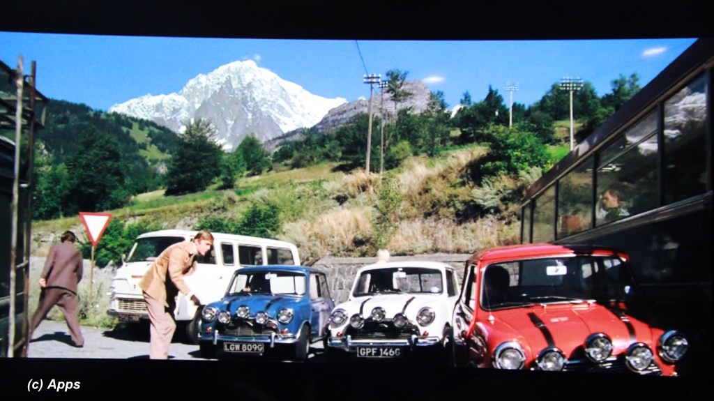 One cannot forget the amazing car chase scenes involving three mini coopers – red, white and blue. All devised by stuntman Julenne Remy – a brilliant coordinator for several action packed films including six James Bond movies. Here is part of the famous car chase scene in question from this film.