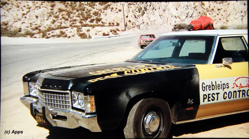 - During the chase, David sees a parked sedan resembling a squad car. but it turns out to be a service car for a pest exterminator named Grebleips.. “Spielberg” in reverse.