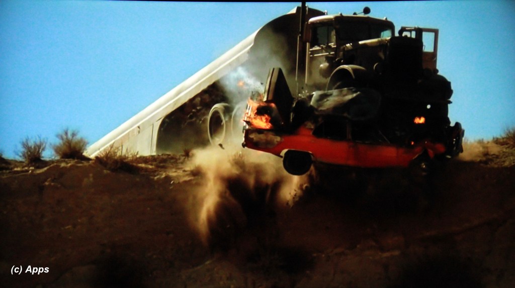 4. David tells the passerby that the truck driver chased him down the mountain nearly 90 miles an hour, but we see a few moments earlier that the car’s speedometer was 100 miles an hour.