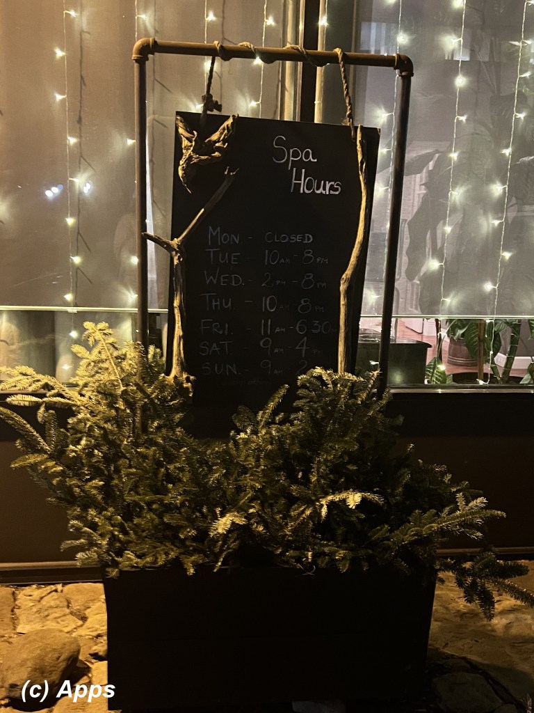 - The entrance to the spa says it all. Its artistically arranged with twinkling fairy lights showing from inside and the spa hours noted on another blackboard kind of plaque.