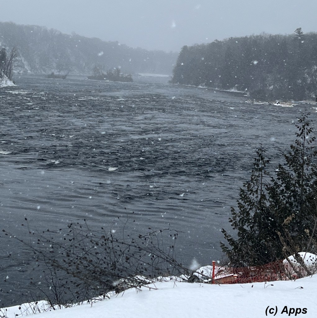 This Hudson Falls Hydroelectric Project was constructed between 1994 and 1996. This is one in a series of dams that had been built on this part of Hudson River since the 1700s enabling the settlers to harness the power of the falls. Originally there was a natural waterfall called Baker Falls with a 68ft. drop. However it is now hidden beneath this modern project. All we can see is a tiny bit of the fall in the form of the flood gates. Although the depth underneath the water that flows our flat is still 60 feet deep.