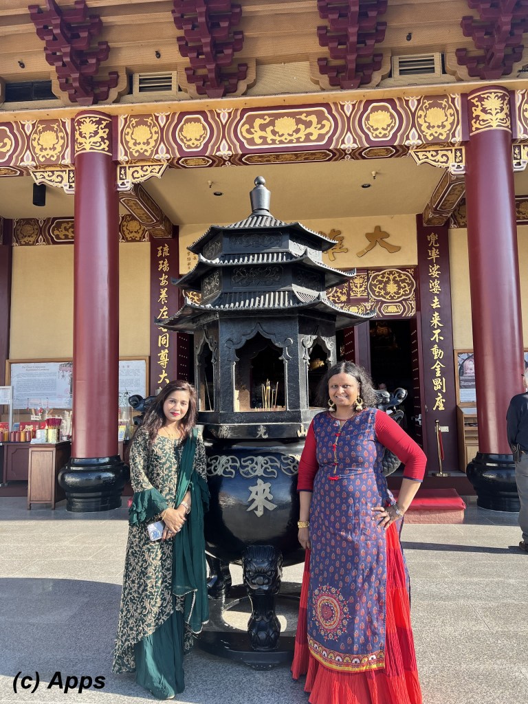 We couldn’t take the pictures inside, so here we are outside in front of the Main Shrine where we could light and place an incense stick in the huge burner behind us. A couple of monks spoked to us. They were courteous and patient with our questions. And one them said that we dressed really well and respected their wishes. 🙂
