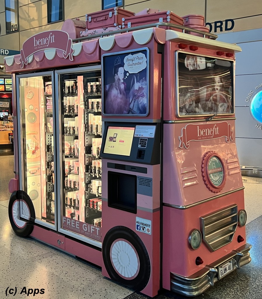 Benefits Cosmetics introduced these cute little kiosks in 2013 to be placed in all major airports. It is a San Francisco based company as you can see with the little subtitle below the name of the store. They are self-serving automatic vending machines for purchasing all kinds of cosmetics manufactured by Benefit.