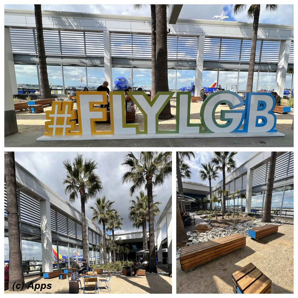 Long Beach Airport in Southern California got a makeover recently. There is a nice addition of seating areas between the gates and the ticketing area constructed to look like one is spending the time by the beach. There is no water of course, but lots of sand, sun, palm trees and wooden benches and tables to relax.