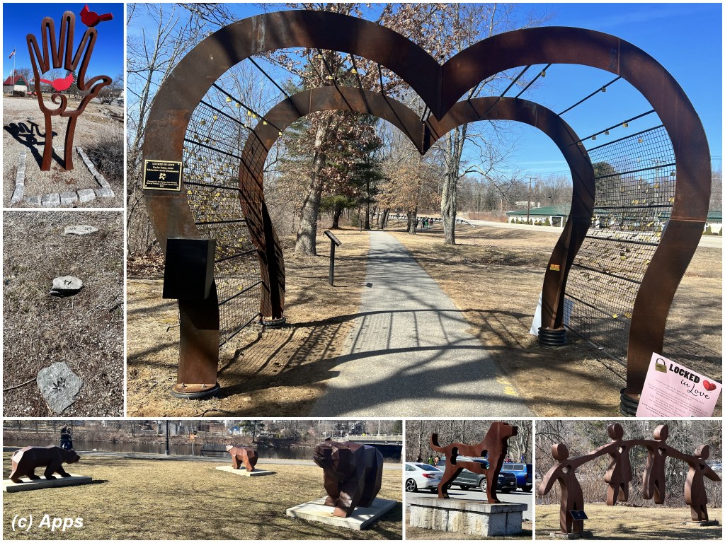 In 2020 Putnam Arts Council and the town set up a Sculpture Trail along the Putnam River Trail. While finishing my 5K, I passed through a lot of those sculptures and here they are: Bird in Hand at the Rotary Club (look for the stony path to the sculpture that has little bird feet etched into them); Locked in Love – By Haley Kuhn for all those love birds to hand their locks; Three Bears; Rusty the American Dog at Putnam Lions Memorial Dog Park; and finally 4 People by Dale Rogers.