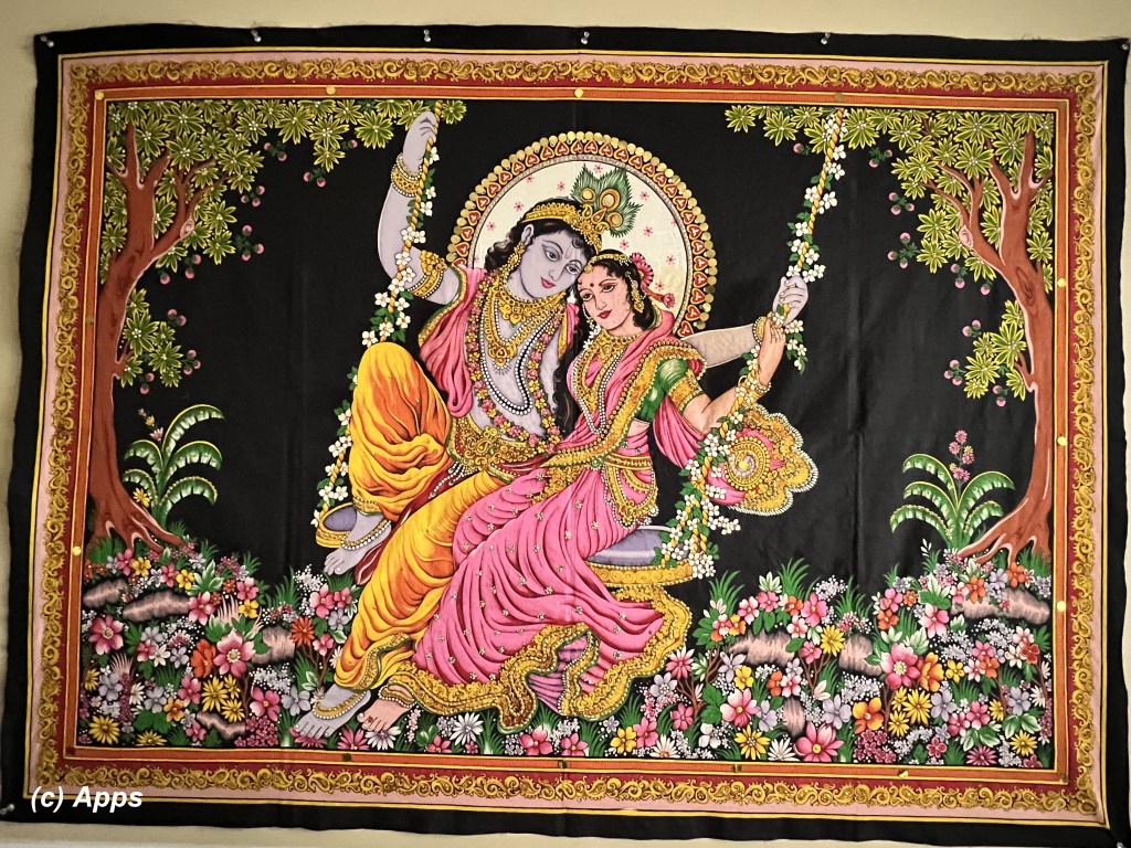 As I mentioned in the very first Ekadasi post, if you put the religion aside, allowing your body to fast twice a month is an excellent way of cleansing and detoxifying to aid in repair and rejuvenation. Pictured cloth painting hangs in my Swing Room that depicts Lord Krishna and his consort Radha having a romantic time.