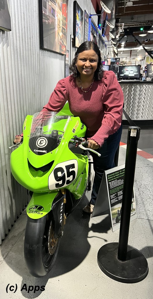 While getting my nephews to enjoy indoor speedway (go karts with speed) in California, we saw this Kawasaki Ninja ZX-10R that was ridden by #95 Roger Hayden and had won the 2008 AMA Superbike Championship Series. Not sure if it was for sale, but the green bike on display prompted us to take pictures with it. Hey, I don’t ride bikes, but I might as well pose for it. 😛