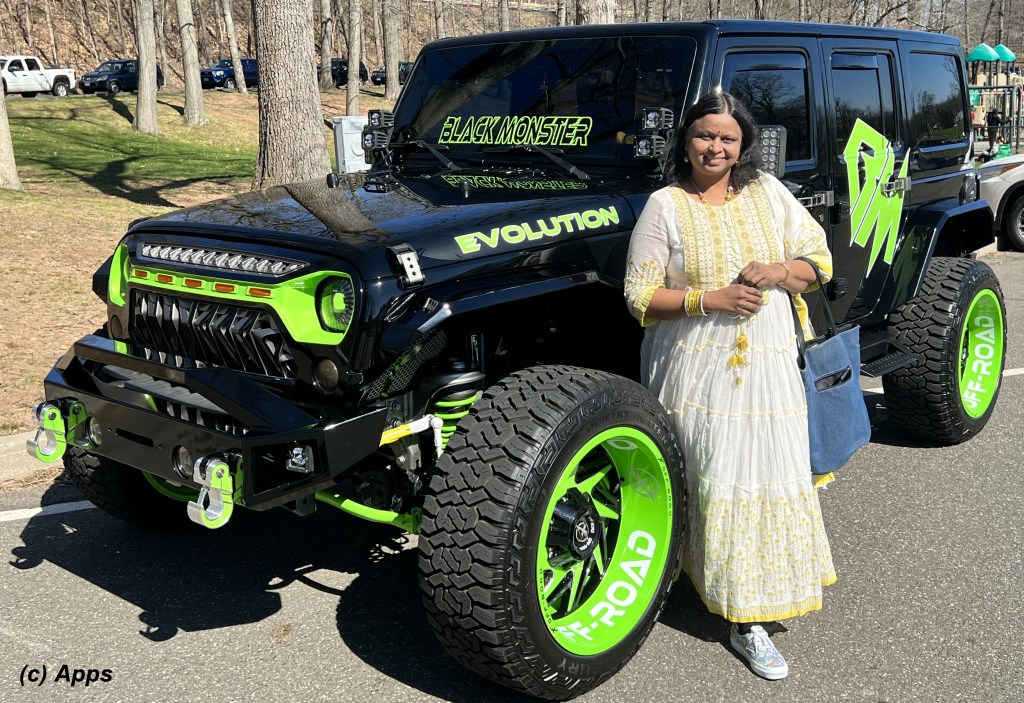 I have no idea what kind of Jeep this was, but when it stood there in the parking lot bright and shiny, I had to get a picture with it. Pretty cool monster it was !!