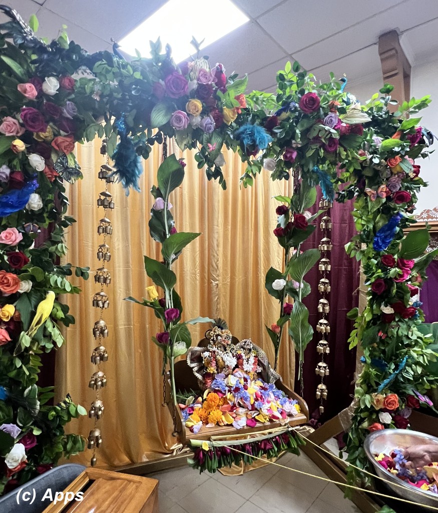 Then in the evening we went to the local temple and took part in the festivities. Here is the decorated jhoola (= swing) with little Lord Krishna enjoying the attention from all devotees.