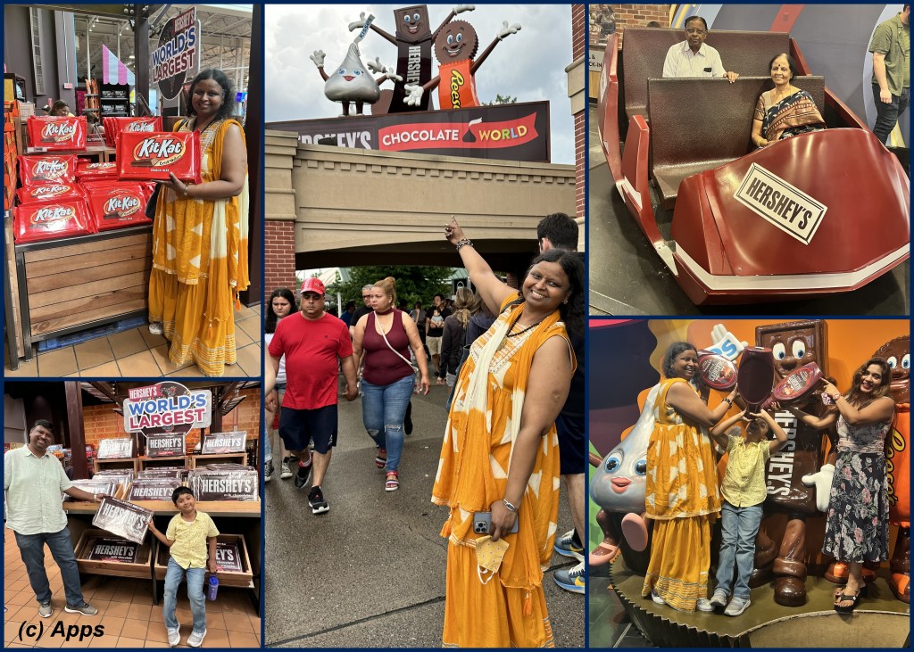 There were several intriguing, funny and unique sculptures all through Hershypark. A few from that trip back in July: Sporting with the world’s largest Kit Kat and Hershey’s bar; Checkout the chocolate structures atop the Hersheypark; Mom Dad enjoying a ride on a Hershey’s car; and finally my nephew enjoying a shower of Hershey’s syrup. It was fun to go through the Chocolate factory and learning a lot about chocolate than just eating.