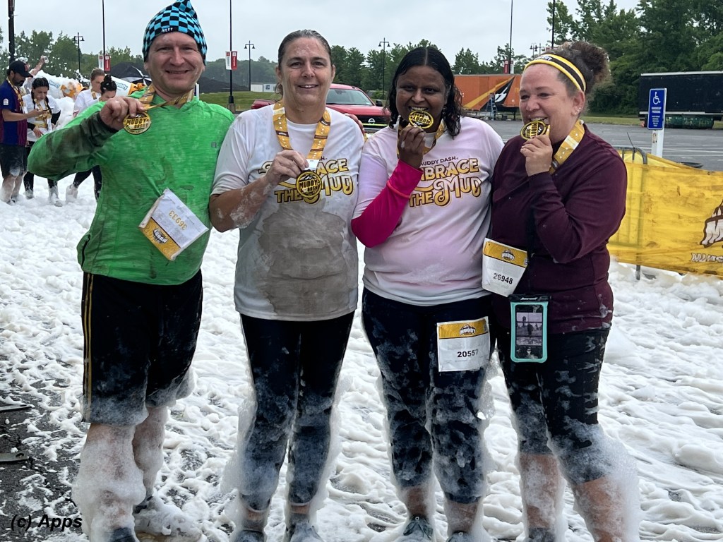 Here are the four of us who went. My friends were kind enough to walk with me instead of doing an actual run. We concluded the mud run going through a foam bath.