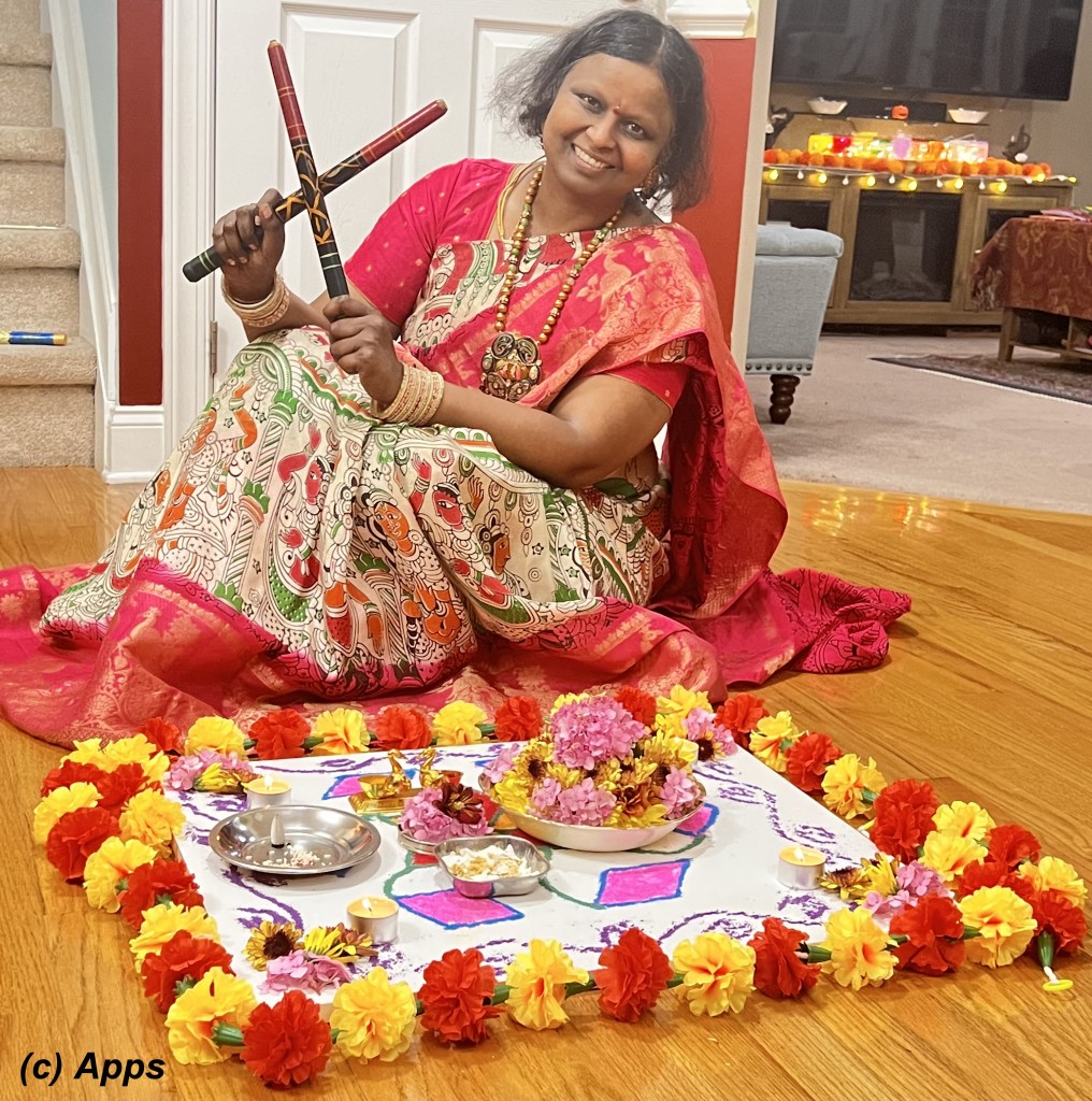 I paired it with gold beaded necklace boasting a Thanjavur pendant with hand painted figures (from the Thanjavur city in the state of Tamil Nadu in India), with matching earrings and color coordinated bangles on my wrists. I am posing with Dandiya Sticks that we use to dance around Bathukamma too.