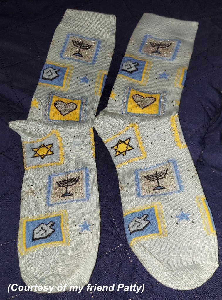 The final day of the Jewish festival Hanukkah ends on Dec 15th this year (2023). All the nine branches of the candelabrum known as menorah are lit on this final day. Followers enjoy the day with music, food and family. Here is a picture of Hannukah socks of a dear friend, I swiped her photo. š