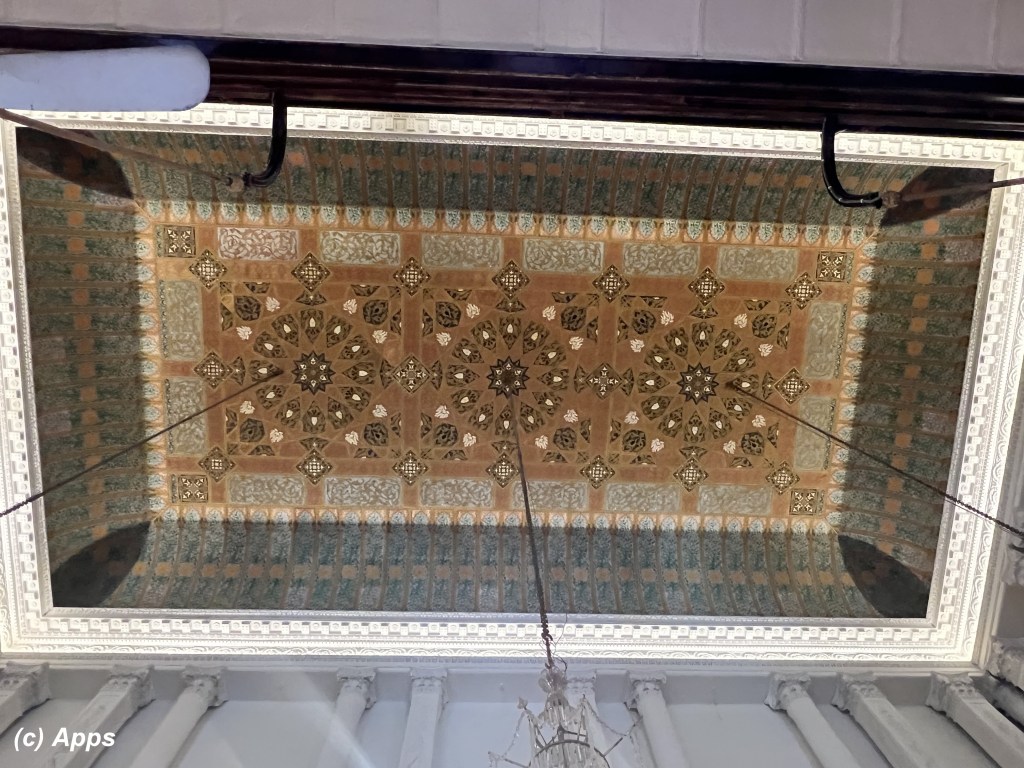 One of the beautiful artistry you get to see in the Darbar Hall of Osmania University College for Women in Hyderabad, India is the ceiling. It is made of painted paper-mache panels using a 19th century technique that was popular in England and Europe. Several sheets of paper are glued onto the moulds, and once they dry they are released from the mould and painted. Individually framed in gilded beading, the panels are a collection of geometric patterns and local motifs.