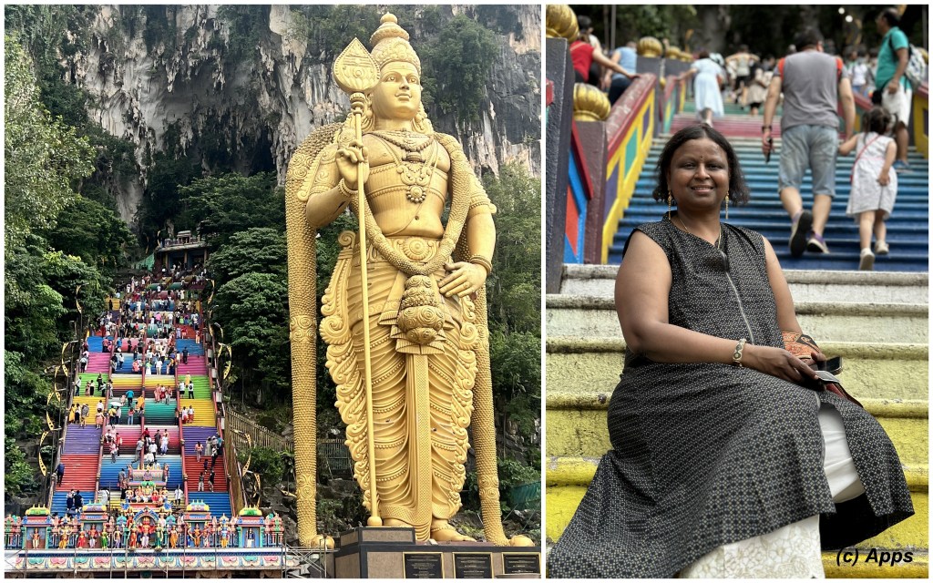Batu Caves is a series of caves on a steep hill in Selangor, Malaysia. It is home for the 10th Murugan Shrine (4th outside of India). The 140 ft statue of Murugan is at the base of the hill with 272 colorful steps on its left side. They were steep and hard to climb (at least for me), but I made it to the top, and we visited the five temples inside these caves.