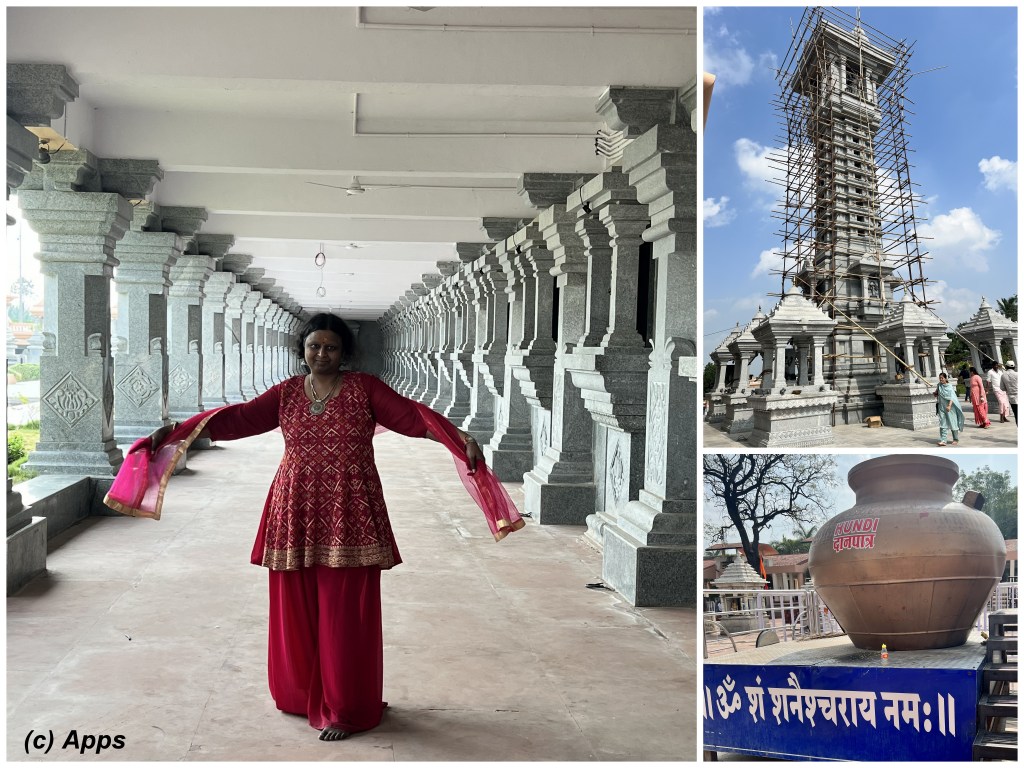 The beautiful Shanidev Temple in Shani Shingnapur in Maharasthra, India comes with some lovely architecture. Most of it being newly constructed but keeping to the traditional stone work. Pictured are: the walkway to the temple that reminds me of the corridor of 1000 pillars in Ramanathaswamy Temple in Rameshwaram, Tamil Nadu, India; Navagraha temples (= for the nine planets or heavenly deities depicting the 7 days of the week coinciding with the 7 planets and last two are the two nodes of Moon); A large donation pot outside the main temple.