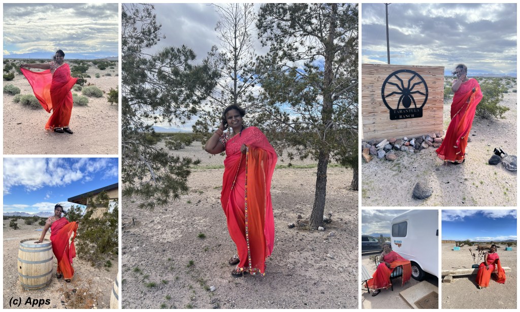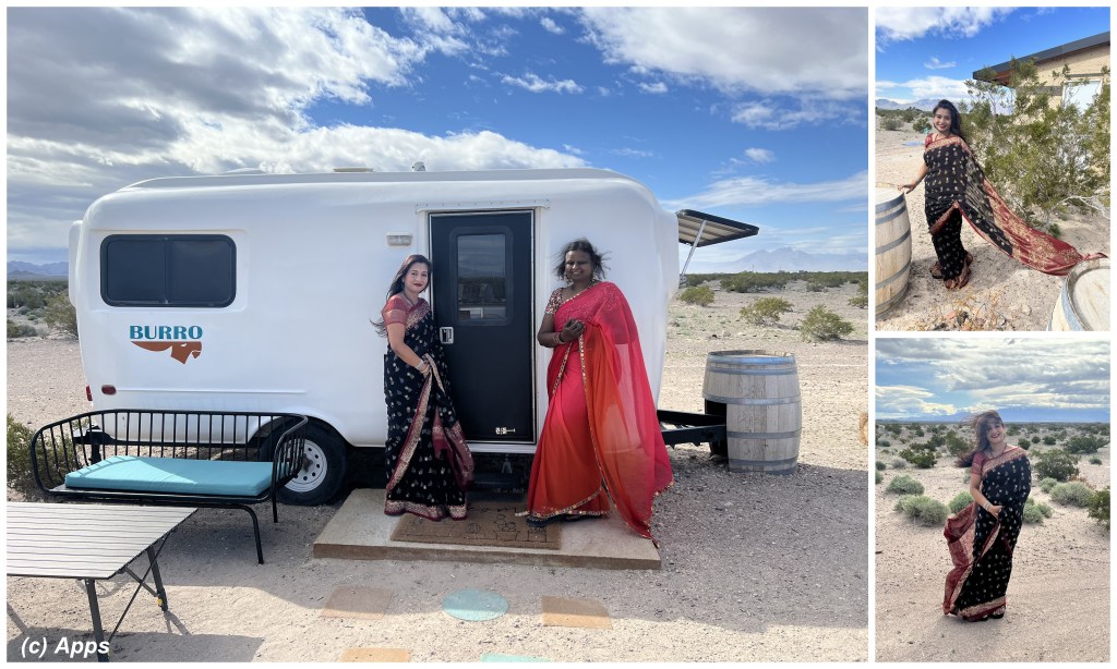 We battled the Sierra Nevada winds on the first day of our Death Valley wearing beautiful Sarees. I wore this bright orange saree with pink shades while my SIL wore the gorgeous black and red combo saree.