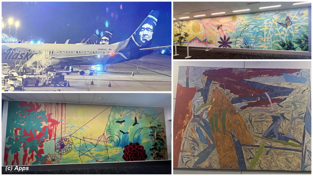 While coming back from California I had a stop over at Charlotte Airport. I found these interesting murals and paintings on the walls. And also on the tail of the Alaskan Airlines flight.