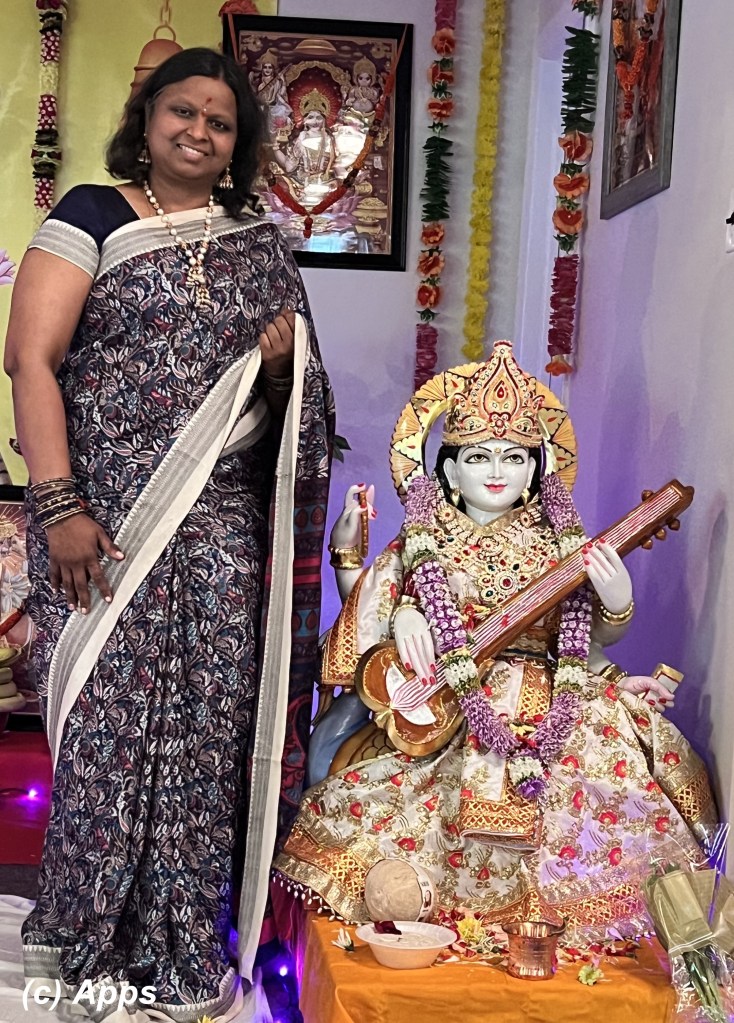 In it’s navy blue and white combination with colorful prints in blue, white, pink, black and brown; this draped daintly and softly around me. I paired them with pearl necklace and earrings and color coordinating bangles on my bracelets. Wore this for a Durga Pooja event.