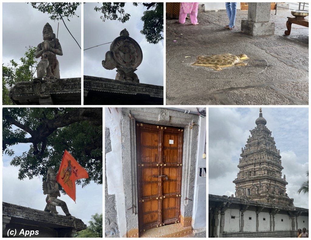 This idol of Rama depicts him before meeting Hanuman, and was called as Kondanda Ramudu and is depicted with a bow. Hence the temple doesn’t have Lord Hanuman along side Rama…but outside underthe Dwaja Sthambham. After meeting Hanuman, Rama’s title changed to Maryada Ramudu, since then he is depicted without the bow and Hanuman always on his side.