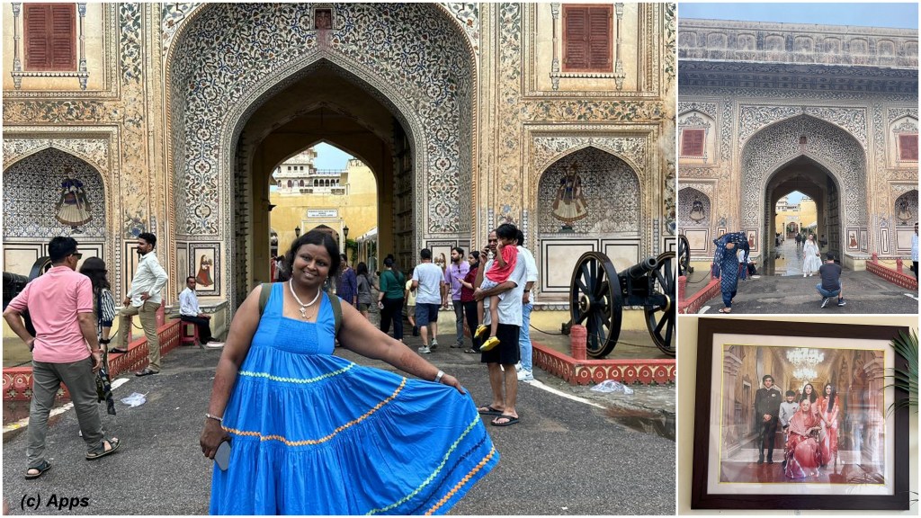 Next up on Day 1in the evening we went to see the City Palace of Jaipur in the State of Rajasthan, India. This was one of the most expensive guided tour we took ever, only because we wanted to see the Blue Room. Perhaps this was the best of the trip – The Blue Room aka Chhavi Niwas. Entrance to the Palace is itself very artistic. This is the place the Royals live when they are in town, so we only get to see the sections that are not used often. Pictured are the current Royal Family.