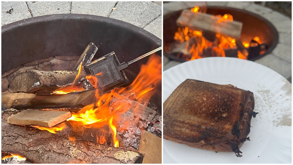 In the trip to the lake house I did with my friends in August, we made Mountain Pies over campfire – both savory and sweet versions. Anything cooked over wood fire gives that smokey flavor to it, that we couldn’t resist taking hot bites of the little sandwiches.