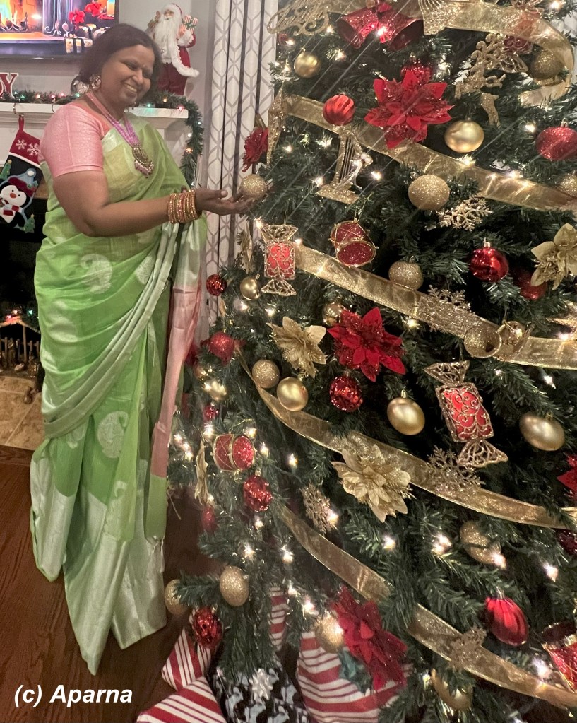Dec 21st 2024 was World Saree Day. And I wore this beautiful green saree with pink border and pink blouse for a Christmas party I went to. I think it was a gift, but cant remember. I paired them with color coordinated bangles on my wrists and a pink bead necklace with a Ram Parivar locket in metal and matching earrings.