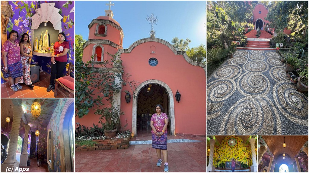 Walking through the Botanical Garden in Puerto Vallarta, Mexico on Day 3, we came across this beautiful chapel in the middle of the garden – Our Lady of Garden Chapel. The exteriors lead up a stone paved stairs to this beautiful pink building marking the chapel. In the inside the walls and fresco are made of several lithographs of the flora and fauna native to Mexico printed onto natural fabrics. It is an homage to the pollinators (bees and birds). Created by David Allen Burns and Austin Young, The wall, behind the altar, represents the daytime (Second from bottom right), and the opposite wall represents the night (Last at bottom right).