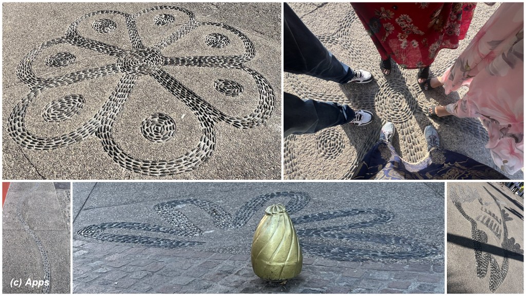 Everywhere we went we saw art work made of pebbles on the roads we walked. It was more and more prevalent at the boardwalk. Amazing to see the different kinds of shapes one could make with just some pebbles and grout (perhaps!). One thing was very obvious, a serpentine line that went all through the boardwalk and surroundings connecting the various pieces of art. Beautiful is one word that came to my mind. π