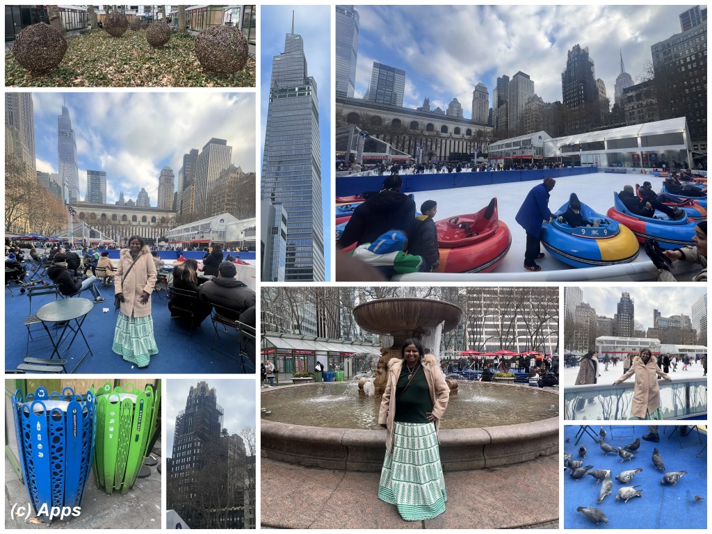 I am not sure if I remember how this park looks like in summer, but it comes alive in winter with pop up stalls, pop up restaurants and an ice rink with the Bryant Park Winter Village. Ironic considering at one time, around 1820s it was a potter’s field, a burial ground for less fortunate people. This year they introduced bumper cars on ice. We tried booking for them but they were booked out till 8pm that day and we had more to do. May be next time we should go just to Bryant Park. Love the sights surrounding it, even the colorful trash cans. 😛