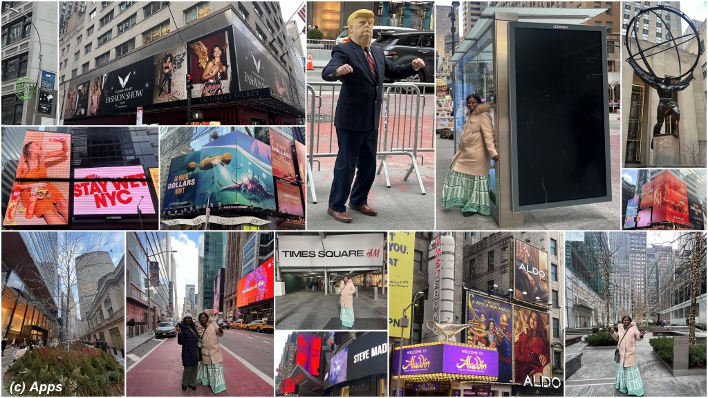 What can one say? It’s Time Square, filled with fun billboards and holiday decorations. :). Don’t forget the street sculptures and street performers, which lead us to Donald Trump performer. 🙂
