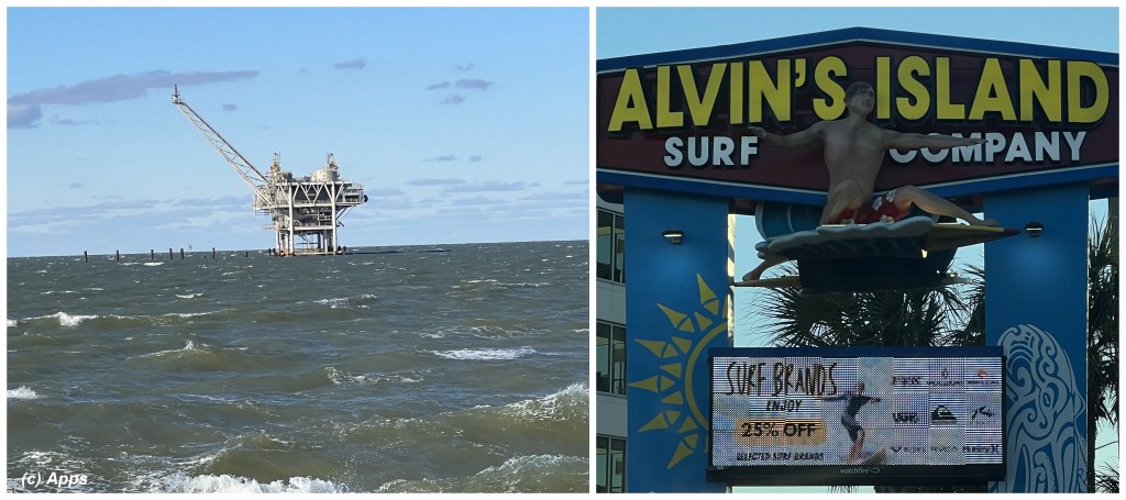 While I was at Foley, AL on Day 2 we visited some of the Oil Well Riggs. We saw almost 9 of them in the ocean. Here is one of them. We also saw this funny surfer dude in front of a store selling surfing wares.