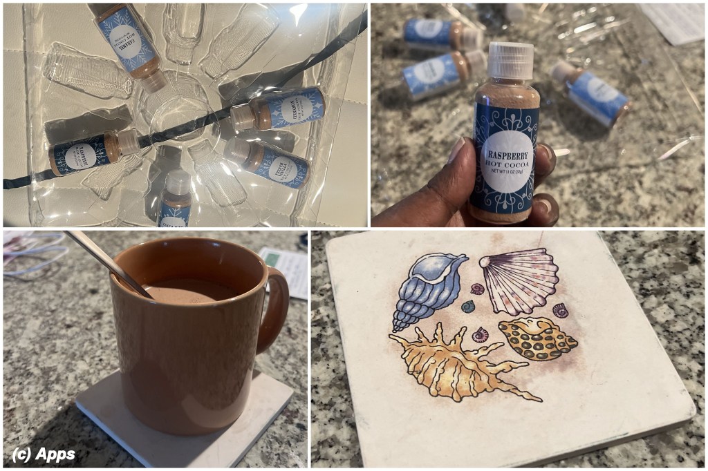 I loved the little hot chocolate pods that she had received as a gift for Christmas. I tried three varieties. Note the colorful coasters.