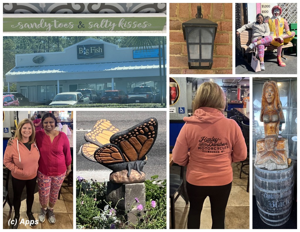 These are things that I saw while visiting my friend in Foley, AL. (From Top to Bottom, Left to Right) – Decorative writing on the walls of Tacky Jacks 2 Bar’s bathroom. Big Fish restaurant where Morgan Freeman frequents. Cobb’s Light named after Benjamin Dewitt Cobb, first Chief of Police of Foley, AL. This light was erected that would glow when there was a call at the dispatcher. Cobb used this frequently as a beat cop, in the age before cell phones and pagers. π Myself with a structure looking like Roland McDonald in front of a Tacky Jacks 2 Bar. A huge butterfly in the middle of the street. My friend wearing the Harley Davidson hoodie keeping her roots to Milwaukee. A mermaid structure.