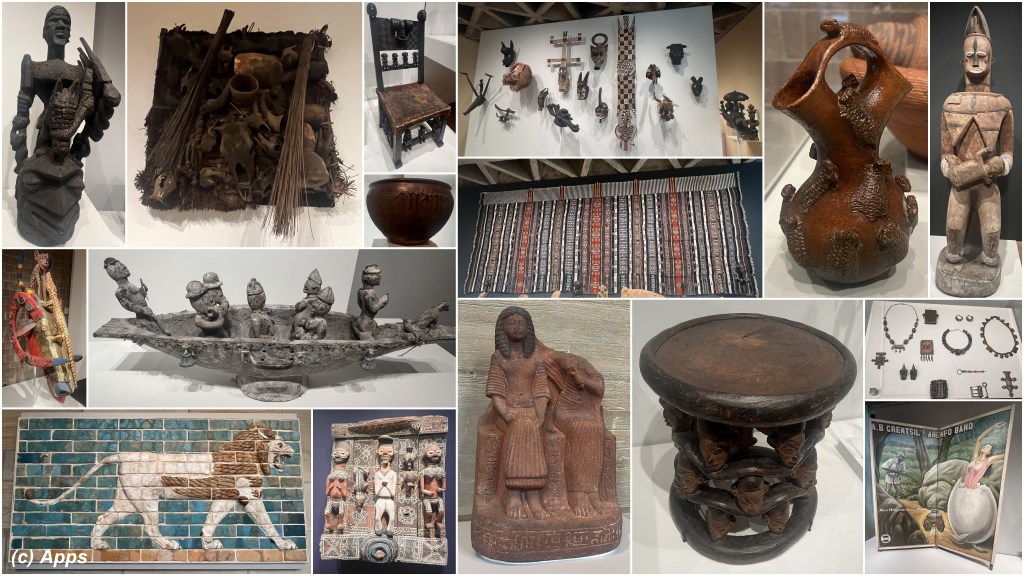 This is the oldest college art museum in the world founded by artist John Trumbull in 1832. Apart from his donated art work, we see an encyclopedic collection form various civilizations across the world from ancient to modern. We begin with African Art, from North Africa, Egypt, etc: Ngbe Leopard Society Lodge Emblem; Animal Head for a Puppet Masquerade; Canoe for Afterlife; Ogun Helmet Mask; Painting from A.B. Crentsil’s Ahenfo Band Production; Wall Panel from a Boy’s Initiation House; Chief’s Chair; Chief’s Stool; Various Masks; Community Brewing Pot; Marriage Bed Screen; North African Jewelry; Maternity Figure; Wedding Vase; Loin Relief from the Processional Way; Pair Statue of Djehuty-em-hab and Iay.